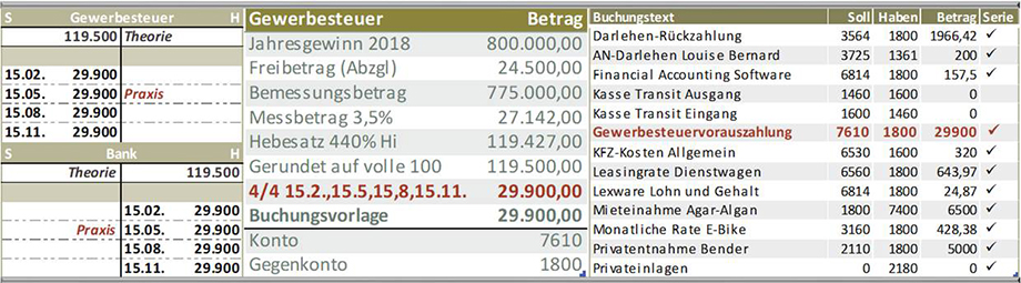 Gewerbesteuervorauszahlung HGB AN Bank. So gesehen ein einfacher Buchungssatz. Der Blick ins Detail ist da schon interessanter: Berechnung d. Gewerbesteuersatzes, Hebesatz der Kommune, Kalkulation in MS-Excel, Abgabefristen zur Vorauszahlung, Kontenfindung, digitale Kontierungsmuster m. automatischer Serienbuchung, Gesetzestexte..."Die Gewerbesteuer ist eine betriebliche Steuer." Dennoch müssen Gewerbetreibende die Gewerbesteuer als Privatentnahme verbuchen...
